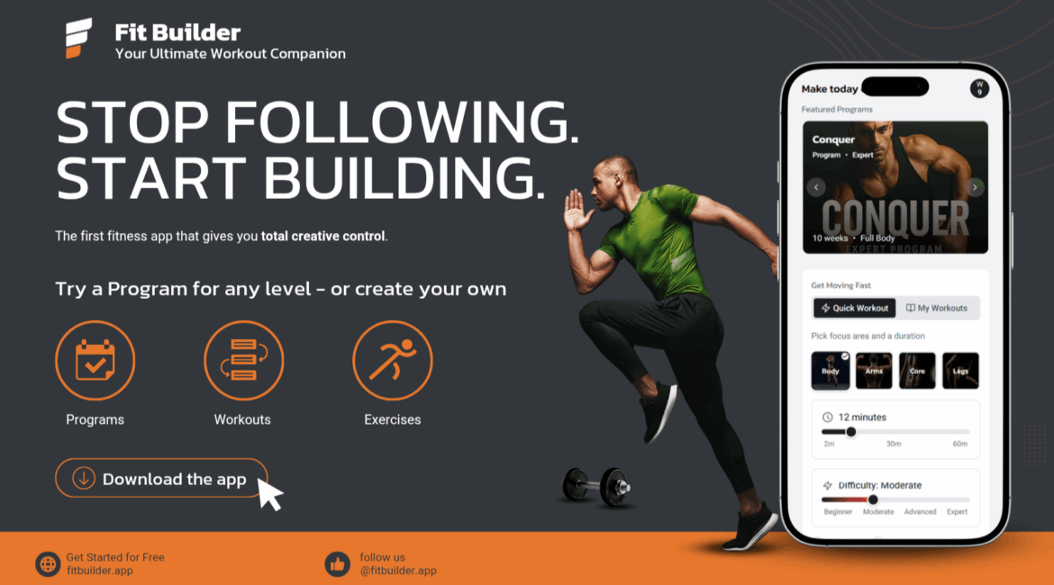 Fit Builder is a modular fitness app which gives users the ability to create custom exercises, workouts, and programs. Other core features include progress tracking, personal record with journal, custom quick workouts and a growing Library with 70+ exercises, +80 workouts, and 4 training programs based on real 10-week programs used to train high-performance athletes and the military. It has partial offline support, themes, dark mode, and comes in a web version (accessible for all devices) and mobile version, for Android. No sign-up or credit card is required for guest users, and premium subscribers have access to all features.